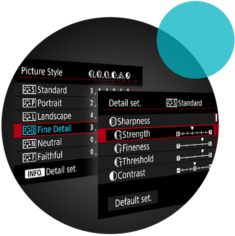 Обработка на слика со голем динамичен опсег Зачувајте ги деталите во површините со осветлени делови и сенки со HDR обработката на слики. Идеален за фотографирање пејзажи и мртва природа, а нуди комбинации од три слики со различни експозиции: стандардни, со недоволна експозиција и со преголема експозиција (природно, стандардна уметност, живописна уметност, нагласена уметност, релјефна уметност). Повеќе експозицииСоздавајте неверојатни композитни слики во самиот фотоапарат користејќи го режимот за повеќе експозиции, кој ги поставува сликите една врз друга и нуди избор на опции за автоматска контрола на повеќе експозиции. Full HD EOS видео снимкиСнимајте Full HD EOS видеоснимки, со креативна рачна контрола на сликата и звукот.Стил на слика со врвни детали Дајте им приоритет на градациите и деталите снимени со сензорот со висока резолуција и стилот на слика со врвни детали, кој нуди и вградени параметри за прилагодување на острината како праг и подобрување на JPEG фајлови - за да можете да создавате слики кои оставаат голем впечаток директно преку фотоапаратот Функции за фотографирање со тајмерСоздавајте одлични видеоснимки со забрзано движење со помош на вградениот тајмер со интервали кој може однапред да се програмира. Ако сакате да фотографирате со неверојатно долга експозиција, блендата може да се заклучи во режим на сијалица во определен временски период.